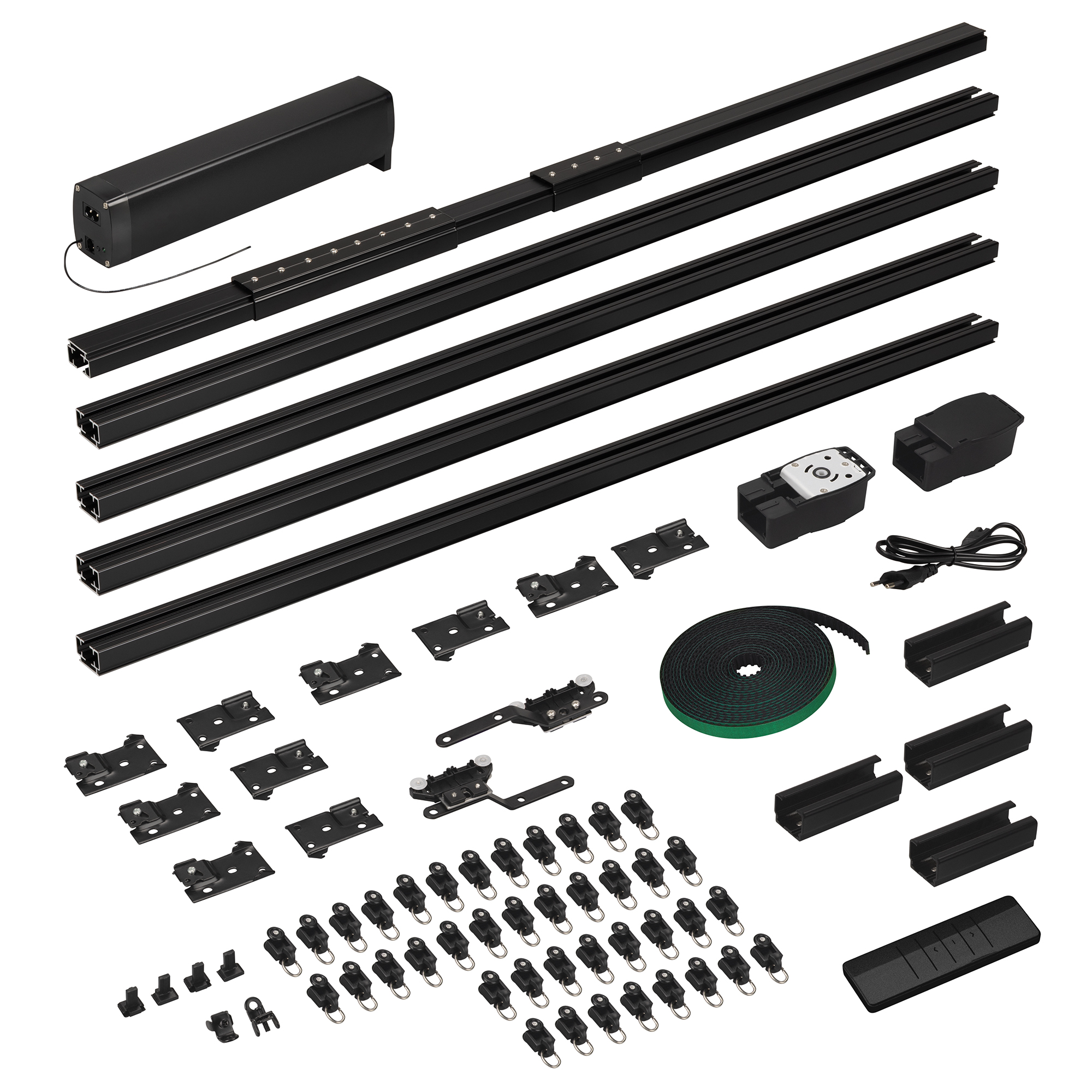Комплект электрокарниза в черном цвете длиной до 5м (регулируется наборными частями) для раздвижных штор, состоящий из мотора, наборного алюминиевого трека, пульта и комплектующих. Электропривод с питанием 100-240В, мощность 45Вт, момент 1.2Нм, вес штор до 40кг. Управление с помощью пульта из комплекта, по WI-FI, 2.4ГГц, Bluetooth, "сухими" контактами на входе RJ11-4P4C. Совместим с платформой TUYA, АЛИСА от ЯНДЕКС. Управление со смартфона через приложение SmartLife, с помощью пульта в комплекте.