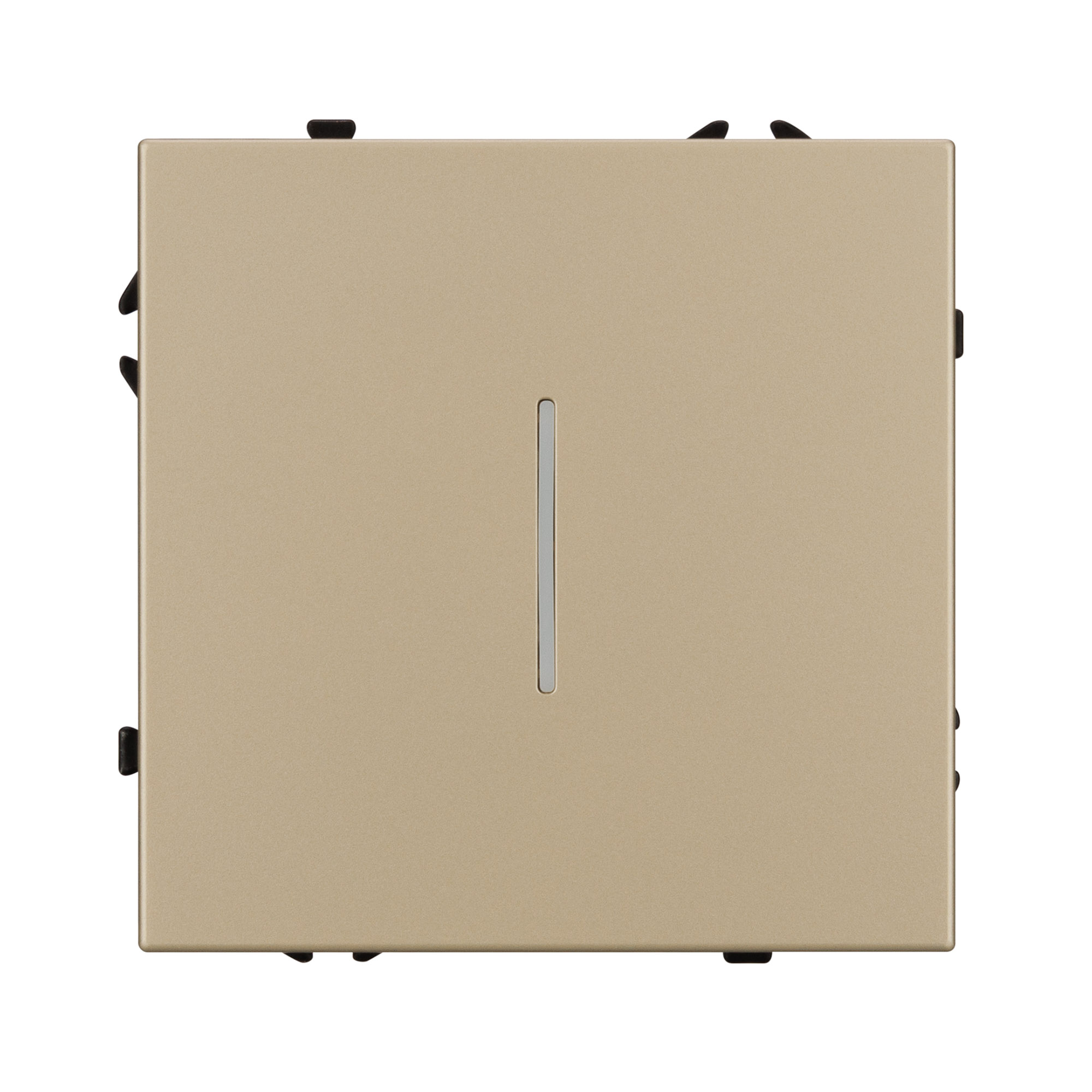 Механизм выключателя света клавишный на 1 пост 1 клавиша (проходной). Цвет - золотой, с Soft-Touch покрытием. Клавиша имеют активную LED подсветку - cинего свечения. Без фронтальной рамки. Уровень пылевлагозащиты IP20. Выключатель устанавливается в стандартный круглый подрозетник круглого сечения диаметром 60мм.
