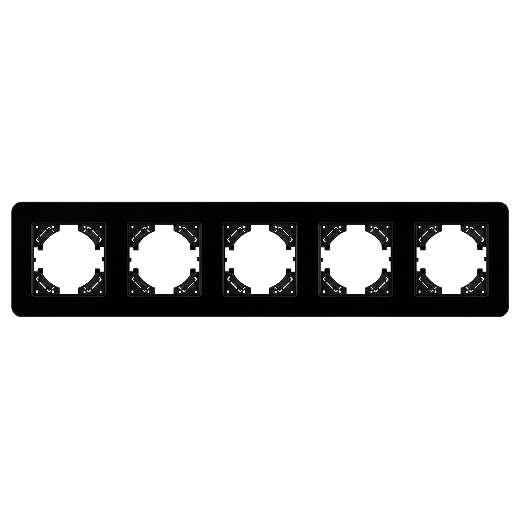 Рамка стеклянная на 5 постов, под встраиваемый механизм. Цвет - черный. Среднего уровня герметичности IP20. Ориентация монтажа - горизонтальная (основным ориентиром служат посадочные выступы для накладки механизма).