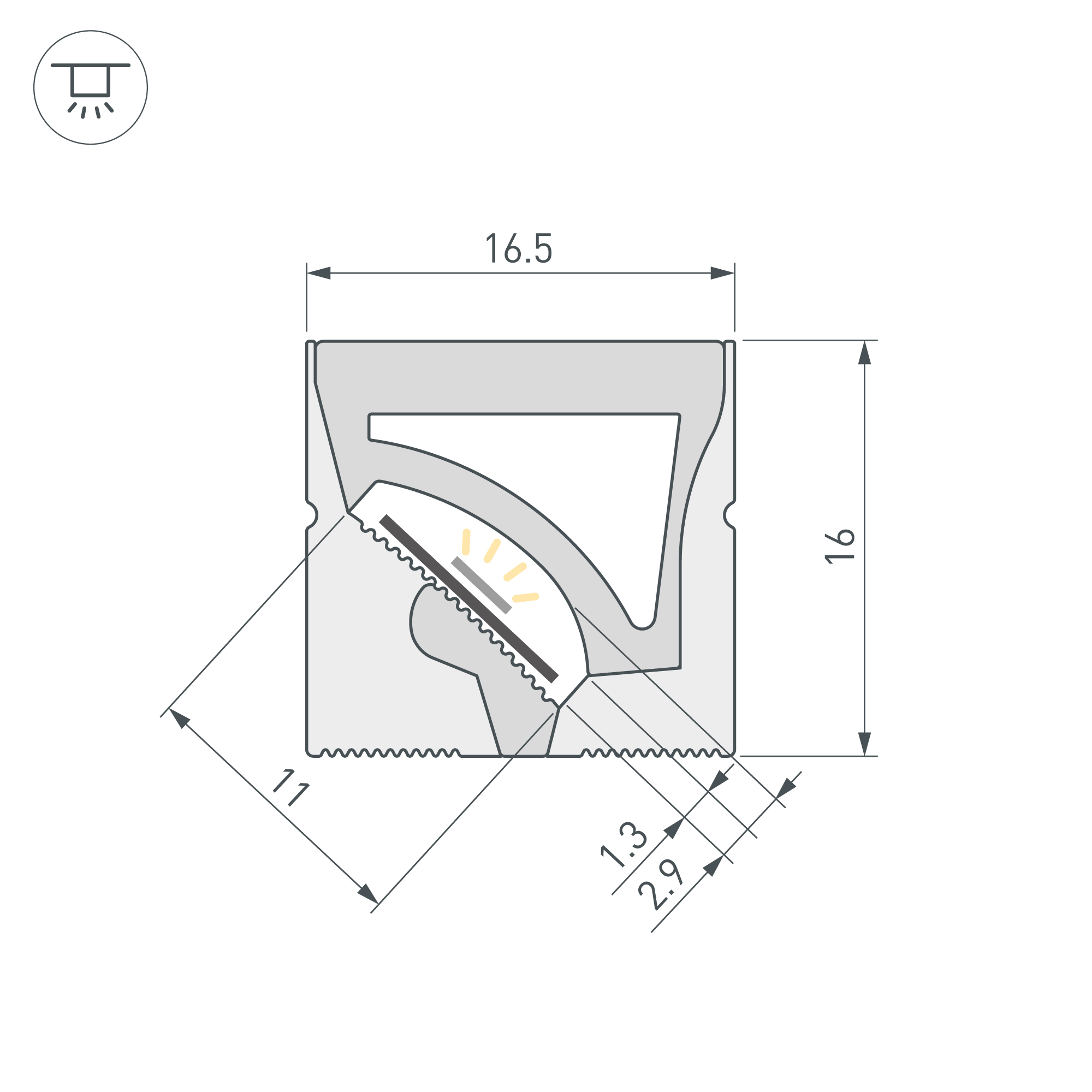 Цельнолитой силиконовый гибкий профиль, белый матовый. Габаритные размеры 5000×16×16 мм. Вертикальный изгиб TOP, минимальный радиус изгиба 50 мм. Горизонтальный изгиб SIDE, минимальный радиус изгиба 200 мм. Для установки во влажных помещениях необходима герметизация при помощи двухкомпонентного эпоксидного герметика. Класс пылевлагозащиты – IP65 (при соблюдении технологии герметизации). Для лент шириной от 8 до 10 мм, высотой до 2,8 мм и мощностью до 10 Вт/м. Угол излучения 115°. Поставляется в катушках по 5 м. Цена за 1 м.