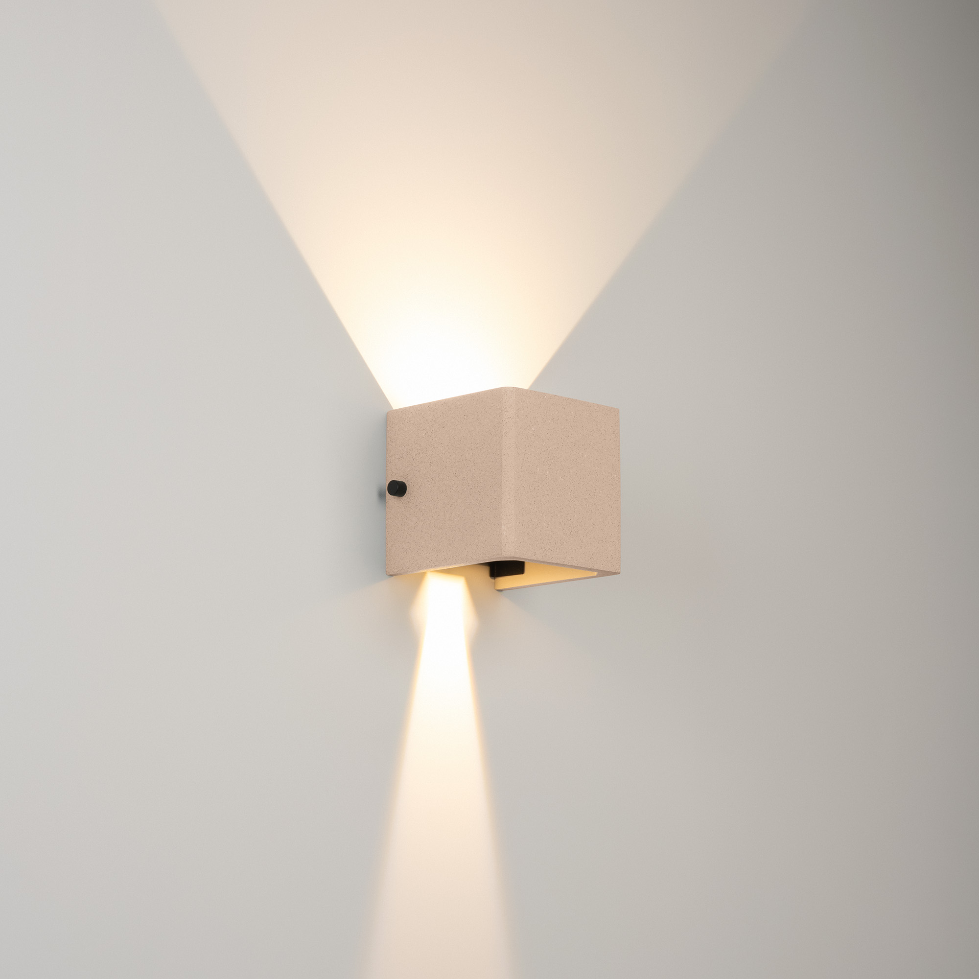 Накладной настенный светильник, свечение вверх/вниз. Мощность 6 Вт, св. поток 286 лм, 49 лм/Вт, теплый 3000 K, CRI>90, изменяемый угол освещения 0°-80°, напряжение питания 230 В. Фигурный корпус из бетона цвета светлой слоновой кости и алюминия, экран ударопрочный PC, степень защиты IP65. Размер: длина 120 мм, ширина 120 мм, высота 120 мм. Монтаж накладной. Драйвер встроенный, пульсация <0.5%.