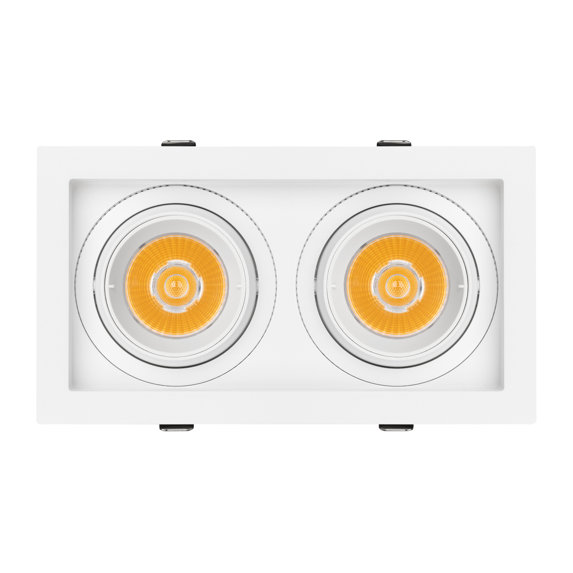 Встраиваемый карданный светильник. Мощность 2х20 Вт, св. поток 4134 лм, 103 лм/Вт, дневной 3000 K, CRI>92, угол 20°, напряжение питания 230 В. Белый корпус из алюминия, черная вставка, степень защиты IP20. Размер: длина 210 мм, ширина 117 мм, высота 105 мм. Монтаж встраиваемый, установочное отверстие: длина 190 мм, ширина 95 мм. Драйвер 24-42 В, 500 мА, пульсация <2%.