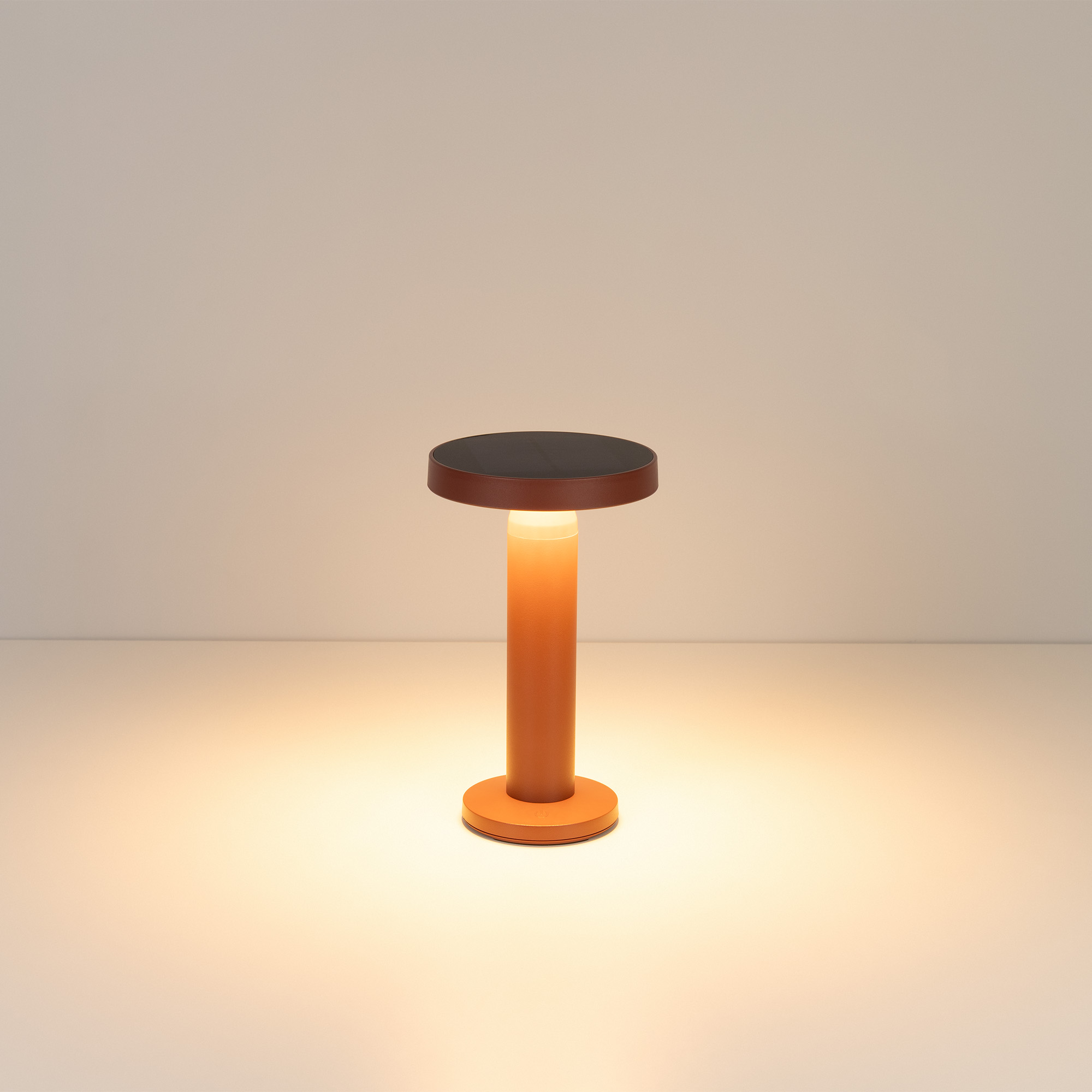 Настольный светильник со встроенным аккумулятором мощностью 1.4Вт, алюминиевый корпус, цвет кортен. Цвет теплый белый 2700K, св.поток 102 лм, CRI(Ra)>85, угол 105°. Размер Ø130x217, размер основания Ø92x18. IP54. Зарядка через кабель USB. Тип встроенного аккумулятора 2000мАч. Солнечная батарея 1.25Вт.